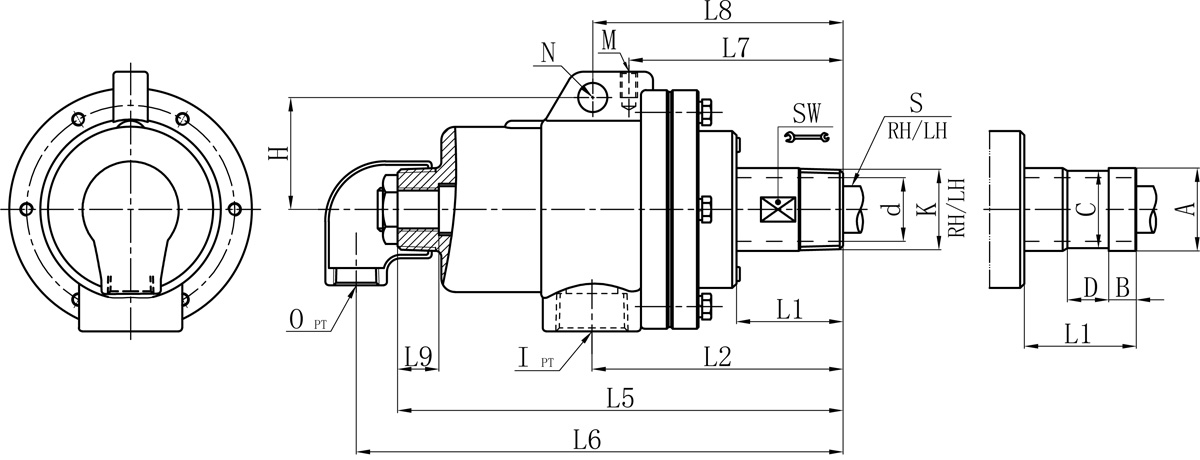 | Model | K | I | O | S | d | L1 | L2 | L5 | L6 | L7 | L8 | L9 | M | N | H | SW | 法蘭式外管尺寸對照表 | |||